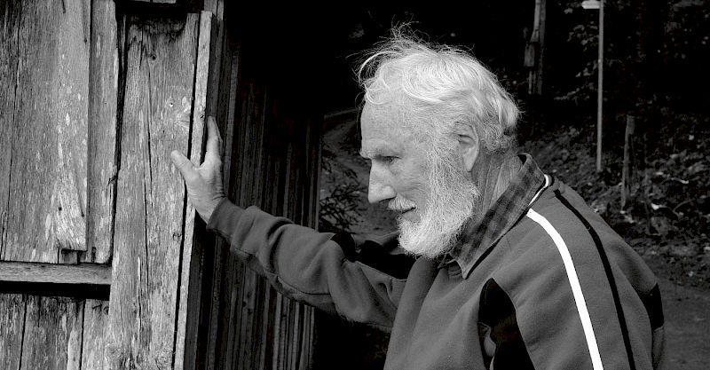 Fred Ryter, mit 7 Jahren bis zu seinem 16. Altersjahr auf verschiedenen Bauernhöfen verdingt (Bild: Fred Ryter am Häuschen der alten Transportseilbahn im Spiggengrund, Kiental)